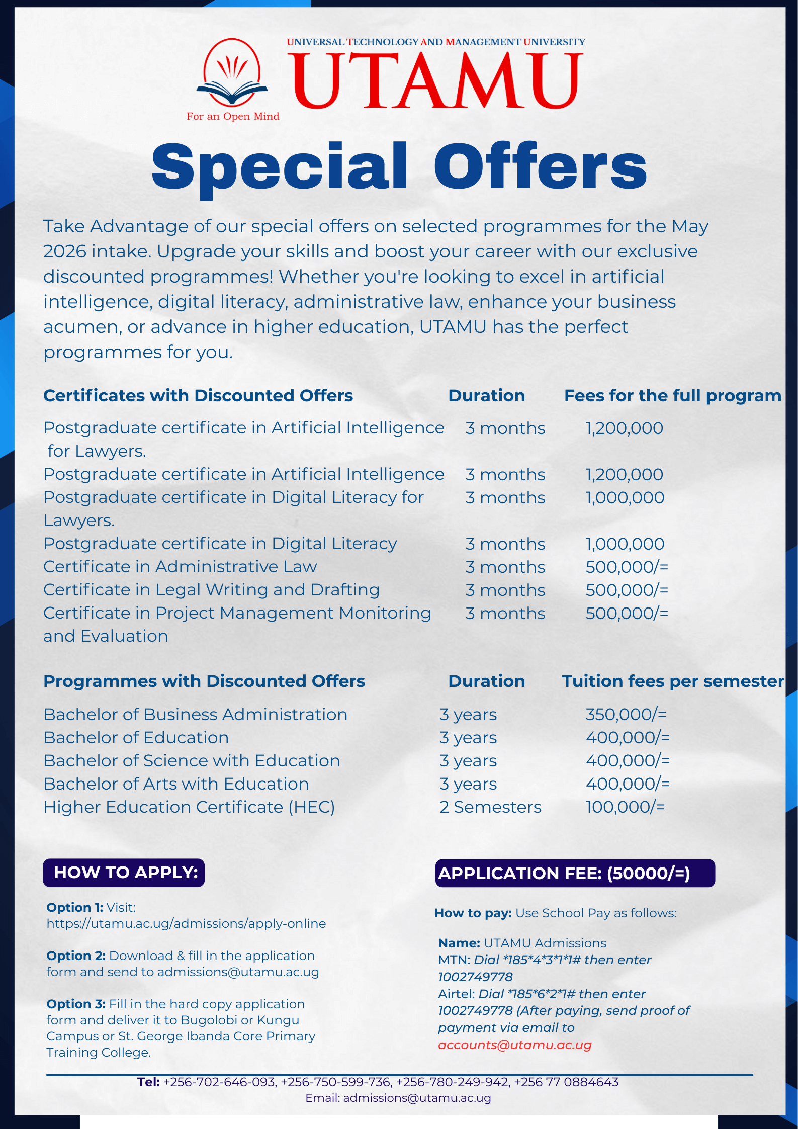 Universal Technology And Management University (UTAMU) has opportunities for every individual interested in pursuing university education at Certificate, Bachelors, Postgraduate Diploma, Masters and PhD levels. Students can enrol for programmes in 3 intakes; January, May and September.