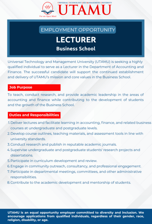 Universal Technology and Management University (UTAMU) is seeking a highly qualified individual...