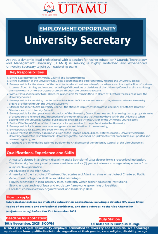 Position: University Secretary Reports to: Vice Chancellor Are you a dynamic legal...